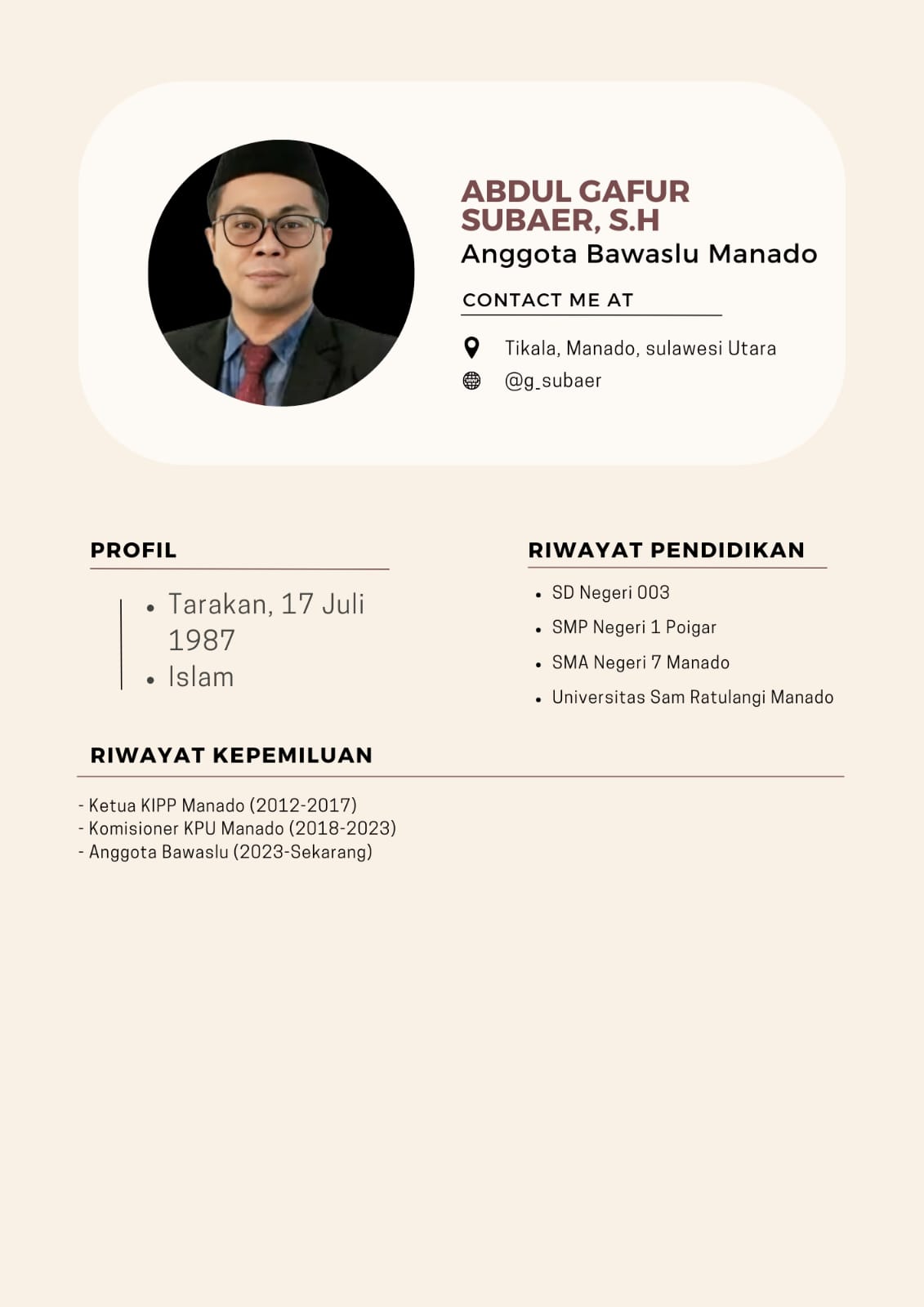 Share Struktur Organisasi Visi dan Misi Sejarah Pengawasan Pemilu Tugas, Wewenang, dan Kewajiban Profil Ketua dan Anggota Bawaslu KETUA (SDM) BAWASLU KOTA MANADO ANGGOTA (HP2H) BAWASLU MANADO ANGGOTA (P3S) BAWASLU MANADO Profil Pejabat Sekretariat Kepala Sekretariat Kepala Subbagian Alamat Kantor